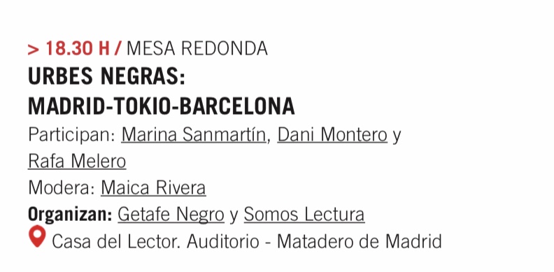 Próximos encuentros. ¿Cuándo nos vemos? 13 octubre, 2022 / Marina Sanmartín *20 de octubre, en la Villa de Barajas: *23 de octubre, en La Casa del Lector, dentro de la programación de Getafe Negro: Compártelo: Haz clic para compartir en X (Se abre en una ventana nueva) X Haz clic para compartir en Facebook (Se abre en una ventana nueva) Facebook Me gusta Cargando...